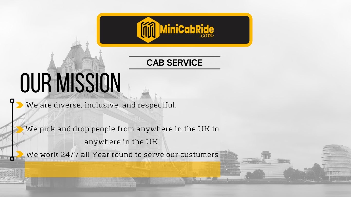We are MiniCabRide Limited We are a private hire operator. Our director’s mission is to help people. We work 24/7 all year round. We move people with pre-booked journeys. We transport people and luggage. We pick and drop people from anywhere in the UK to anywhere in the UK.